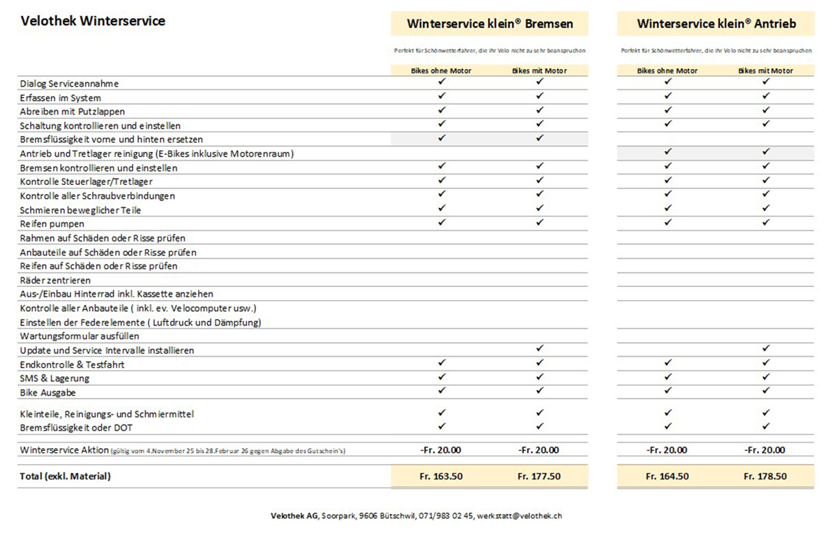 Und das Beste: Während der Winterservice-Aktion gibt es auf den kleinen Service 20.- Franken Rabatt und auf den grossen Service 30.- Franken Rabatt! Wer sein Velo sogar im November anmeldet, profitiert zusätzlich von unserem Gratis Hol- und Bring-Service – bequemer geht’s kaum.