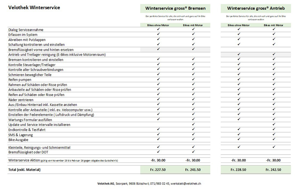 Und das Beste: Während der Winterservice-Aktion gibt es auf den kleinen Service 20.- Franken Rabatt und auf den grossen Service 30.- Franken Rabatt! Wer sein Velo sogar im November anmeldet, profitiert zusätzlich von unserem Gratis Hol- und Bring-Service – bequemer geht’s kaum.